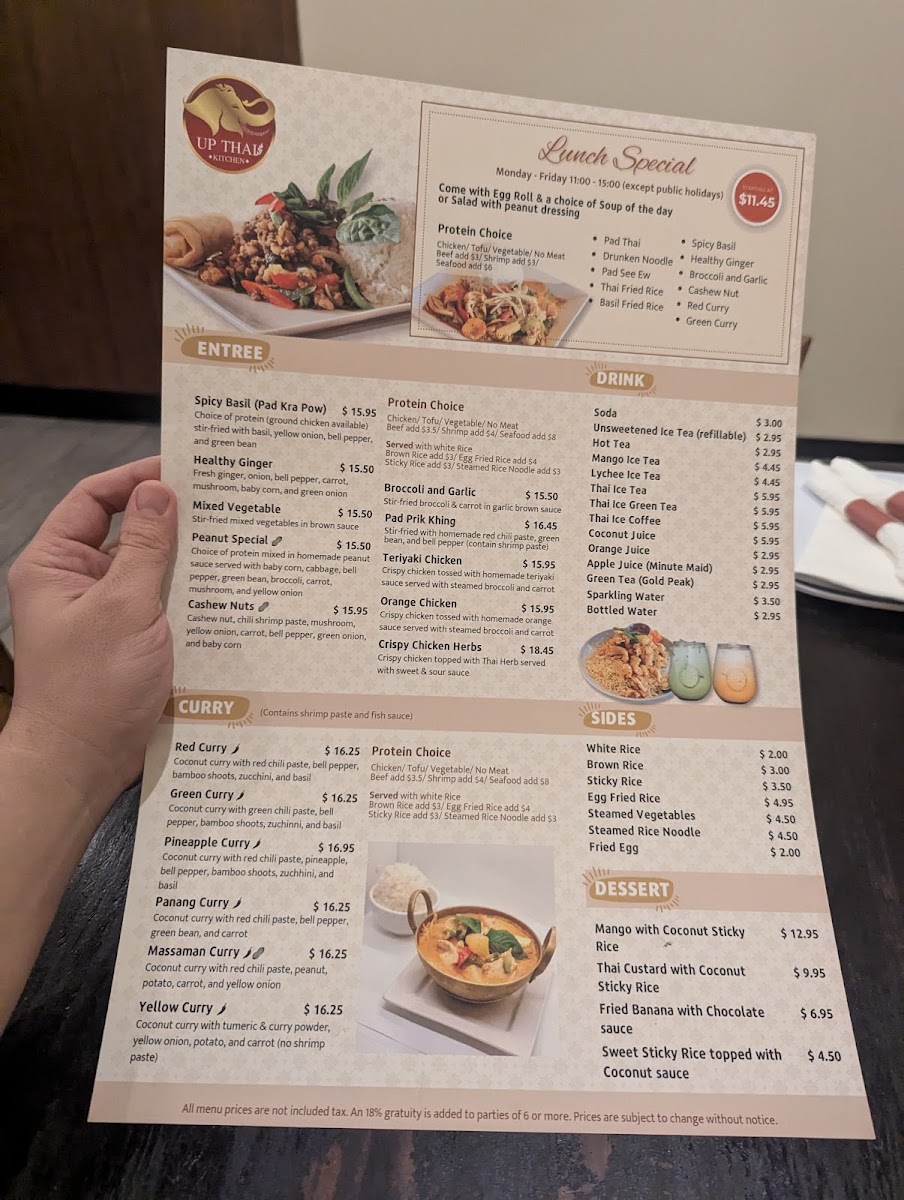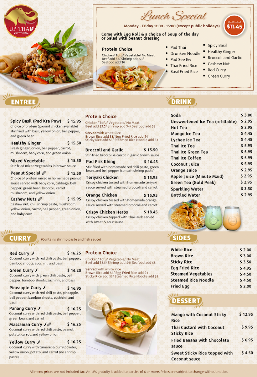 Welcome to Up Thai Kitchen, a delightful gem located in Cypress, TX, where authentic Thai flavors meet a warm, inviting atmosphere. The menu offers an impressive array of dishes, starting with Soups like the Dumpling Soup, rich with chicken and vegetable dumplings, or the invigorating Tom Yum, brimming with fresh lemongrass and kaffir lime.